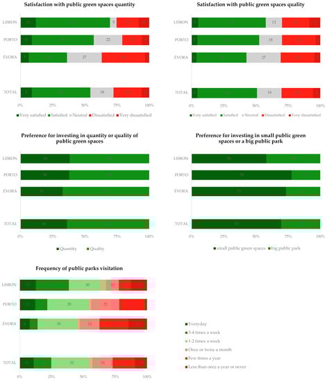 Three main results may be drawn from these two questions. First, respondents are moderately satisfied with public green spaces. In fact, approximately half of the respondents are satisfied or very satisfied with both the quantity (54%) and quality (51%) of the public green spaces. These results deserve to be framed in the study conducted by the European Union [46], where EU residents living in cities rated their satisfaction with green areas on a scale from 0 (‘not satisfied at all’) to 10 (‘fully satisfied’). Although urban populations living in Portugal revealed a moderate satisfaction with their green areas (6.0), it must be noted that Portuguese respondents were among the five countries with the lowest rated satisfaction. Second, the general results achieved by these two questions are very similar, with the only evident difference being a slightly worse evaluation of the public green space quality. Third, the results show important differences between cities. The city dimension seems to influence the evaluation of both the quantity and quality of public green spaces, since the evaluation tends to be more positive with the increase in the city’s size. In fact, respondents from Lisbon are the most satisfied with both the quantity (70%) and quality (57%). Respondents from Porto are also rather satisfied, even more moderately, with the quantity of public green spaces (57%) and with its quality (53%). Respondents from Évora are the least satisfied with their city’s public green spaces, and particularly with their quantity, with a clear division between respondents who reveal being rather satisfied (37%) and those who are rather dissatisfied (37%).