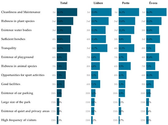 Taking into account the overall results, ‘cleanliness and maintenance’ is rated as the most important public green space characteristic (16.1%, range by city, 15.9–16.3%). The high priority given to this attribute matches several studies conducted worldwide. For instance, in a comparative study conducted in four European cities, (Berlin, Stockholm, Rotterdam and Salzburg), cleanliness was rated as the most important park characteristic for park visitors [23]. Similar results were found in Vienna (Austria) [8], in Guangzhou (China) [52] and Karachi (Pakistan) [53]. In a review paper on qualitative research about the influence of urban parks in park use and physical activity, McCormack et al. [54] also found that cleanliness and maintenance within parks were regularly identified as important factors.