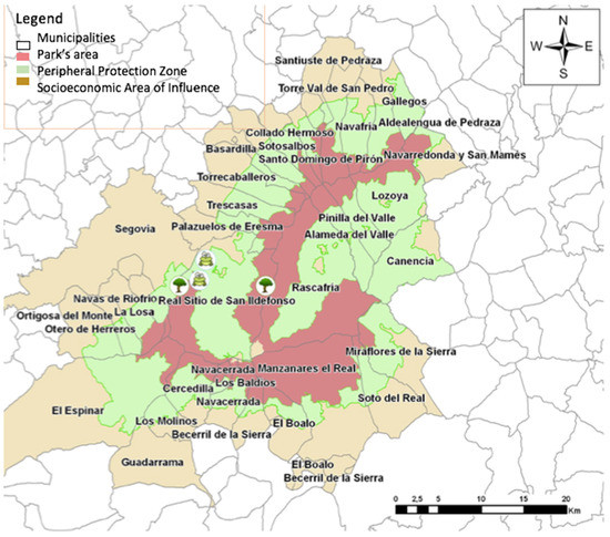 The Sierra de Guadarrama National Park occupies 33,960 hectares, and is located in the mountain range of the Central System (Figure 1), forming part of the natural division between the northern and southern plateaus that make up the center of the Iberian Peninsula (Spain and Portugal). In addition, its peripheral protection zone is 62,687.26 hectares (this has its own legal regime, designed to promote the values of the park in its surroundings and to minimize the ecological or visual impact of the exterior over the interior of the park), and its legal area of socioeconomic influence is 175,593.40 hectares (Figure 2)—the total area of the municipalities where the National Park and its Peripheral Protection Zone are located [22].