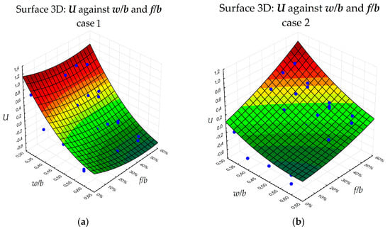 Results of utility analysis of concrete with GGBS are presented graphically (Figure 4a,b). Conclusions are identical as in case of concrete with fly ash, however GGBS does not increase utility with extremely low w/b—around 0.3. This effect may happen because of relatively short time of curing for GGBS concrete, which is usually tested after 56 or 90 days due to the longer time of optimal hydration. While using the utility function, the user should pay attention to proper selection of curing time. On the other hand, under construction conditions, a short time of curing is necessary to obtain the desired formwork efficiency.