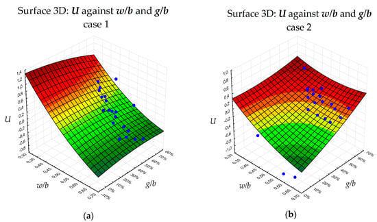 where w/b is the mass ratio of water and binder (both cement and additive), g/b is the percentage of GGBS in the binder, and ai, bi, ci, and di are coefficients. Coefficients ai, bi, ci, and di are determined using the least squares method in Statistica for the best regression (Figure 2).