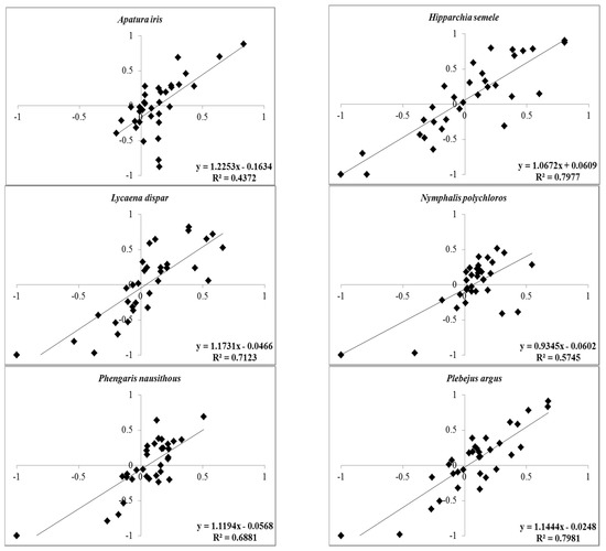 We found a strong positive relation between the values of IEIoccup based on number of occupied cells in land-cover classes, and IEIabund based on abundance of land cover classes within 1 km squares, for three out of six species: P. argus (R2 = 0.7981), H. semele (R2 = 0.7977), and L. dispar (R2 = 0.7123). A slightly weaker relation was found for P. nausithous (R2 = 0.6881) and clearly weaker ones for N. polychloros (R2 = 0.5745) and A. iris (R2 = 0.4372). Results are here presented in the form of a regression instead of Pearson’s correlation in order to assess also the slope of the relationship: Deviation of the regression slope between the two indices from 1, indicating a bias in the IEI values, was observed especially for A. iris and L. dispar (slope = 1.23 and 1.17, respectively), primarily due to a few outliers occurring for some unfavorable habitats (Figure 1).