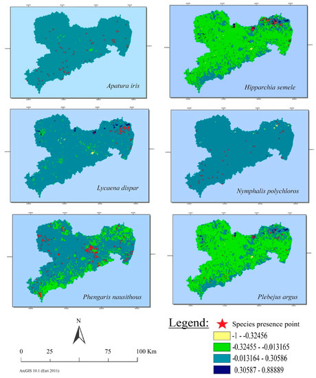 Maps based on land cover class preferences (from both IEI and experts opinions) were generated by assigning the identified suitability values to the vector map of the biotope and land cover (BTLNK). Presence data for the six butterfly species originated from records during the years 2000–2008 was used to generate points in ArcMap based on their respective co-ordinates. Following number of presence points found for each species: A. iris (69), H. semele (65), L. dispar (51), N. polychloros (37), P. nausithous (200), and P. argus (49). Later, these vector maps and presence points were used in “point to polygon” analysis for distance investigation. Further, maps were then up-scaled to create a second raster map with a resolution of 1 by 1 km, so that suitability maps and the presence-points would have the same spatial resolution. Conversion of the vector maps to raster was performed by using the tool “polygon to raster” (Arc Toolbox, ArcGIS 10.1, Esri, Redlands, CA, USA) [55]. Each 1 km2 cell was assigned the land cover type value based on “maximum combined area” (i.e., the most dominant land-cover type). We used the “maximum combined area” approach to represent dominant land cover. Presence-points of species were overlaid on the 1 km2 cell resolution raster maps for visual assessment.