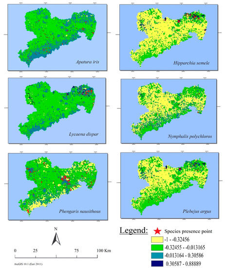 At small scales, precision is another issue to consider and could be relatively easily assessed by visiting field sites. However, when working at regional or larger scales it is not possible to verify the given information over the whole region and we thus depend on large datasets on land cover and species distribution [6,59,60,61]. A visual inspection of the detailed raster when compared to the 1 km2 maps indicated that the positions of presence-points (red stars), as they were set to a single point within 1 km2 grid cells, likely do not reflect the exact habitat in which the species was originally observed, and in highly diverse landscape mosaics, they are actually unlikely to do so. In other words, the presences may actually fall into habitats that are of lower suitability because of small nearby patches of high suitability and thus the statistical model is incorrectly assigning high suitability values for more abundant habitat types, while biasing against small-scale habitats. Notably, most of the mismatches occurred for smaller-scale habitat types. Additionally, some presence records seem to be in unusual habitats because of migration events. For example, Reinhardt et al. (2007) explained the single record of Hipparchia semele in the upper regions of the Ore Mountains (Erzgebirge) by a single migration event from Bohemia [62]. Further, elevation has not been considered in preparing the IEI-maps. Potential habitats in the mountains, which were considered as suitable, may in fact be unsuitable because of the climatic niche of the assessed species (e.g., Lycaena dispar), and therefore, spatial gradients need to be re-inspected to consider more than just land cover. Finally, the suitability of rare habitat types is very difficult to evaluate using presence data, and hence these should be taken with caution. Experts may be better than statistical models to identify such discrepancies.