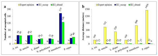 Spatial concurrence between observations and evaluations: (a) Number of occupied cells found in preferred suitable area based on IEI and experts opinions, and (b) average distance between the occupied cells and nearest suitable habitat.