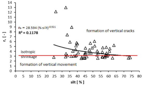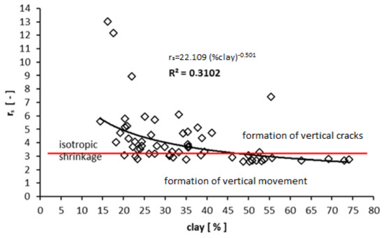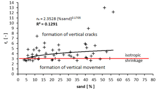 In accordance with Equation (1), Equation (2) can be interpreted as follows. In the case of shrinking without cracks, rs = 1. In the case of crack formation and without decrease, rs. For all other cases, for formation of drained cracks and a surface decrease, occurring simultaneously, the following values are distinguished: rs = 3 for isotropic shrinking; 1 < rs < 3, while vertical movement is more prevalent than horizontal shrinking. If rs > 3, then the formation of cracks is more prevalent than vertical movement.