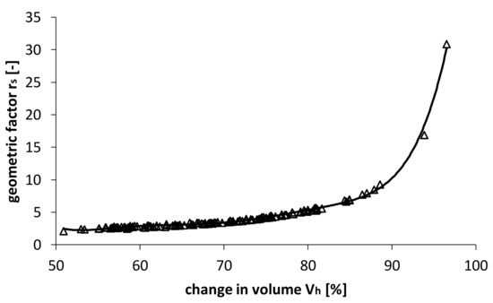 Considering that during the drying, the change of sample height in the direction of the vertical axis of sampling is measured, and volume of soil sample saturated by water, and volume of dried soil sample is measured also, it is possible to calculate the geometric factor rs from Equation (4). By adjusting the equation, we get a relationship for calculating the geometric factor in the following shape.