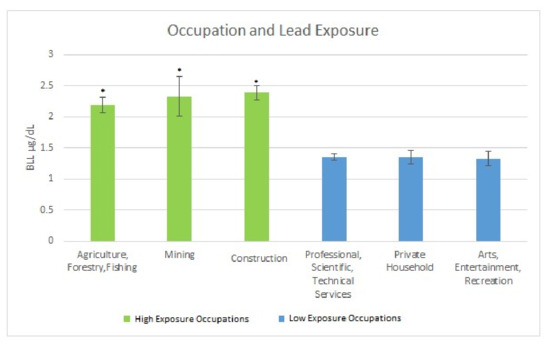 The occupations providing a high level of exposure as measured by mean BLLs were: (a) Agriculture, Forestry & Fishing 2.19 µg/dL (SE = 0.118); (b) Mining 2.33 µg/dL (SE = 0.34); and (c) Construction 2.39 µg/dL (SE = 0.12). The occupation providing the lowest levels of exposure as measured by mean BLLs were: (a) Professional, Scientific, Technical Services 1.35 µg/dL (SE = 0.05); (b) Private Household 1.35 µg/dL (SE = 0.11); and (c) Arts, Entertainment, Recreation 1.33 µg/dL (SE = 0.11). These occupations were examined to see the effects of long term exposure on makers of interest via looking at those who had these jobs as their job of longest duration. Figure 1 below illustrates the findings.