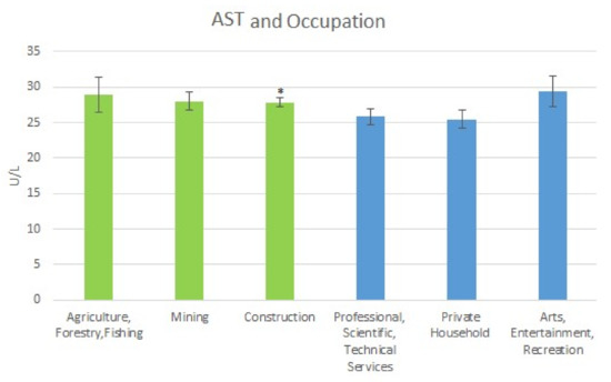 Occupation and Mean AST Levels. * Moderately Significant difference between Construction and Private Households.