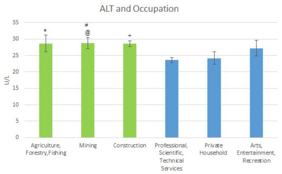 Occupation and Mean ALT Levels. * Moderately significant difference between Agriculture and Professional Scientific, Technical Services. # Significant difference between Mining and Professional Scientific, Technical Services. @ Moderately significant difference between Mining and Private Households. + Significant difference between Construction and Professional Scientific, Technical Services, and Private Households.