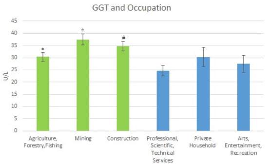 Occupation and Mean GGT Levels. * Significant difference between Agriculture Forestry, Fishing and Professional Scientific, Technical Services. + Significant difference between Mining and Professional Scientific, Technical Services and Arts, Entertainment Recreation. # Significant difference between construction and professional.
