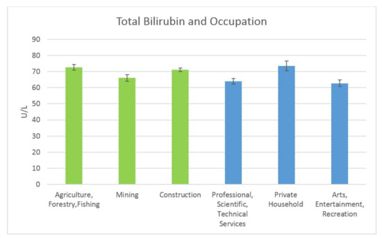 Results of the mean total bilirubin levels for the high exposure and low exposure occupations were also obtained. For the high exposure occupations, the results were as follows: for Agriculture, Forestry & Fishing, it was 0.79 mg/dL (SE = 0.02); for Mining, the mean total bilirubin level was 0.74 mg/dL (SE = 0.03); and for Construction it was 0.79 mg/dL (SE = 0.03). For the low exposure occupations, the mean total bilirubin levels were: Professional Scientific, Technical Services, 0.80 mg/dL (SE = 0.04); Private Household, 0.73 mg/dL (SE = 0.04); and Arts Entertainment, Recreation, 0.80 mg/dL (SE = 0.04). The mean total bilirubin levels are shown in Figure 5 below.