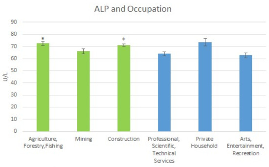 Occupation and Mean ALP Levels. * Significant difference between agriculture and professional and arts. + Significant difference between construction and professional and arts.