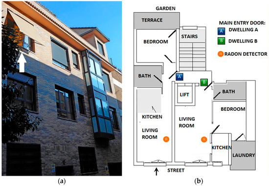 The building is located in a radon-prone area, which was identified, in part, from the information given by MARNA (it is an acronym in Spanish of “MApa de Radiación gamma Natural”) [11] and “Radon Project 10 × 10” [12]. The survey was performed in a building constructed in 2012 that consists of three floors above the ground floor and two levels beneath. The Energy Performance Certificate gives the building a standard energy and carbon emission efficiency grade of 40.3 E, which is a typical rating for a home. A photograph of the building is shown in Figure 1a. The total built surface area of the building is 1459 m2 over a parcel of 459 m2. Each floor contains three dwelling units; two of them are one-bedroom dwellings of similar size and the other one is a two-bedroom dwelling. Figure 1b shows the floor plan of a one-bedroom dwelling, including a complete floor layout, the use of each area, the location of detector used in the previous study [8], and other relevant elements, such as doors and windows. Throughout this paper, the first dwelling will be labeled with the letter “A” and the other one with the letter “B”.