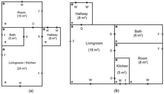 CONTAM SketchPad representation of (a) dwelling “A” and (b) dwelling “B”, including the surface of each room. The open diamonds represent the fans (denoted with letter F), windows (W), and doors (D). The filled squares indicate the individual zones. The open squares with the letter “C” inside indicate the sources of the radon contaminant.