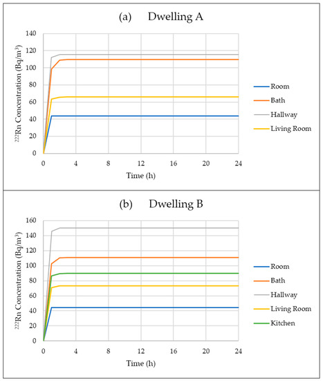 Evolution of radon concentration in (a) dwelling “A” and (b) dwelling “B”, considering the parameters from Table 1. The results were obtained from simulations using the CONTAM software following the methodology described in the paper.