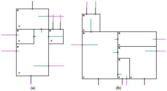 CONTAM SketchPad representation of pressure and flow in (a) dwelling “A” and (b) dwelling “B”. The airflow rates are denoted as green lines and pressure differences as pink lines.