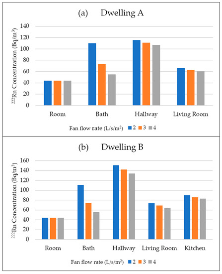 Evolution of radon concentration in (a) dwelling “A” and (b) dwelling “B”, considering the variation of the bathroom fan flow rate. The results were obtained from simulations using the CONTAM software following the methodology described in the paper.
