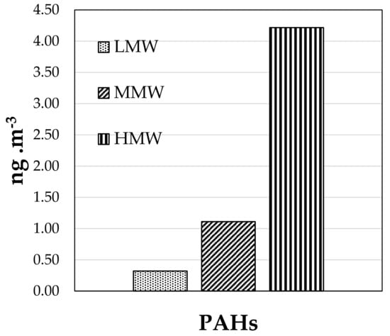 The average atmospheric concentration ± standard deviation of the sum of 14 PAHs determined in PM2.5 at Guadalajara was 5.65 ± 4.60 ng·m−3 and ranged from 4.55 ± 3.29 ng·m−3 to 10.2 ± ng·m−3 (Tables S1 and S2). The most abundant PAHs were those with higher molecular weight (HMW-PAHs: BghiP, IcdP, BbF, BaP and BkF), accounting for 74.7%, followed by middle molecular weight PAHs (MMW-PAHs: Chry, BaA, Pyr and Flt), accounting for 19.7%, and lower molecular weight PAHs (LMW-PAHs: Phe, Flu, Acy, Acn and Ant), accounting for 5.6% (Figure 2). Because HMW-PAHs have the lowest vapor pressure, that group of compounds tends to be more strongly associated with the particle phase than MMW- and LMW-PAHS [].