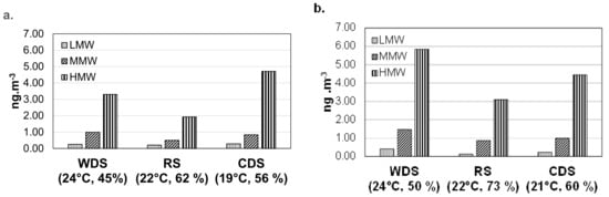 Overall, average atmospheric concentrations of total PAHs were similar between both sites but showed seasonal variation, with the highest environmental levels during the dry seasons and the lowest in the rainy season (Figure 3), similar to a report from Mexico City []. Increases in PAH atmospheric concentrations during the cold-dry season may be attributed to lower environmental temperatures, resulting in a stronger tendency of PAH to bond to particles. Also, lower photochemical activity can lead to fewer atmospheric chemical reactions and higher ambient PAH levels, whereas a decrease in the concentrations of these compounds over the rainy season may be mainly attributed to wet deposition. Seasonal trends in Centro are consistent with those atmospheric parameters; the highest levels were found during the coldest season and the lowest were in accordance with rainfall increases and the highest temperatures. Unlike Centro, the median during the dry-warm season for Miravalle was found to be significantly higher (p < 0.05) than that in the cold-dry season (Figure 3b). It was observed that concentrations of HMW PAHs in Miravalle during the dry-warm period were about two times those found in Centro (Figure 3a). Since meteorological conditions such as temperature and relative humidity are similar (Figure 3) at both sites (p > 0.05), the different patterns in Miravalle could be mainly attributed to a substantial contribution of vehicular activity to PM2.5 by local traffic due to the major PAHs in HMW such as IcdP and BghiP, which are indicators of fossil fuel combustion. In comparison with Centro (3.38 m/s), the lower wind speed (2.57 m/s) recorded for Miravalle could favor less dispersion of air pollutants in the warm-dry season.