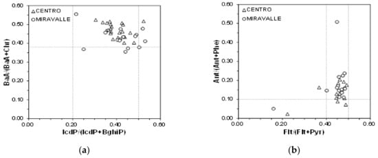 PAH cross plots for the ratios of (a) BaA/(BaA + Chry) vs IcdP/(IcdP + BghiP) and (b) Ant/(Ant + Phe) vs Flt/(Flt + Pyr) in Centro and Miravalle.