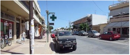 Figure 1. A typical urban road section at Alikarnassos district, Herakleio, island of Crete: the sound environment is mainly determined by road traffic, street morphology, materials, and human activities linked to shops and services. - Social practices dimension level (milieu dimension), describing all of the uses that the area already offers, and additionally any other uses that may additionally be offered, as well as acting on a master land use plan level that welcomes (or discourages) some distinct uses, such us open-to-public or “intra muros” spaces, restaurants, cafés, bars, public places, schools, playgrounds, markets allowing multiple events, etc. This dimension level is not fully predictable, but the possibility of choosing to implement or avoid and even exclude certain activities may affect the global acoustic environment. Figure 2 illustrates the milieu dimension that analysis contains.