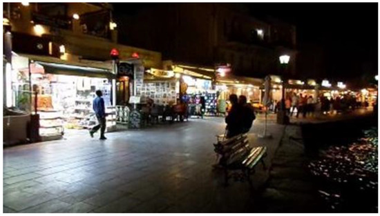 Figure 2. Typical evening in Old Port of Chania, Island of Crete: the sound environment is mainly determined by touristic activities as shopping, the promenade on the seaside, eating, drinking, and clubbing. - Soundscape dimension level, characterizing the most aesthetic and symbolic links that residents establish with the particular sounds of their neighborhood. These are highly valued by their aesthetic characteristics, such as some natural sounds, city sounds, e.g., church bells, markets, play-yards, etc. (see Figure 3 as an example). This dimension is also quite difficult to predict; however, it contains an important factor for the success of a broader noise action plan. Figure 3 illustrates visually an urban agglomeration location in Chania (old city port) where both inhabitants and tourists can rest and enjoy the spatial landscape with the adjoining soundscape. This view presents the dimensions of the sound environment to focus on. The sources and their relative impact on people’s perception were therefore described in order to understand where people may enjoy the soundscape’s full length in each location, and eventually the minimal conditions of their existence.