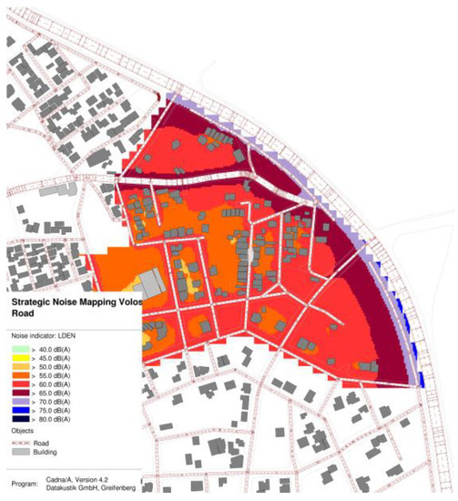 Strategic Noise Map (SNM): Lden index simulation in Karagats urban area, Volos, Greece.