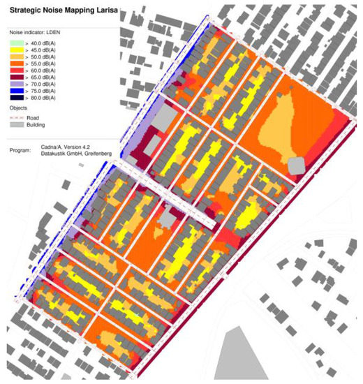 Although major developments have been implemented in the new framework (CNOSSOS-EU), it’s also important to integrate sound sources related to human activities (leisure, work, neighborhoods) in order for them to be taken into account in the evaluation. The noise maps of specific noise sources, such as transportation networks, cannot take other sources that participate in the formation of the rich sound envelope in which we live into account. In the period between 2012–2016, in the urban agglomerations of Volos (Figure 4), Larissa, Chania, Heraklion, Corfu, Agrinio, and Thessaloniki, such methodology has been applied and implemented in particularly selected urban areas due to their special sound identities. In many cases, these urban areas have been chosen because of their proximity to a main transportation network node (peripheral road and train stations in Volos, or train lines in Larissa, or international airports such as Heraklion and Corfu). Some of these Urban Areas have also been selected because they are expected to experiment with a major modification of the existing local network of mass transportation (such as the relocation of the international airport of Heraklion, or the opening of the new metro line in Thessaloniki, etc.). Some urban agglomerations were also interesting case studies for testing the possible modification and reorganization of their traffic plans (Volos city center, Larissa, Agrinio, Thessaloniki), including also the impact of mitigating noise by specific measures such as noise barriers, the introduction of urban roundabouts (Volos), or pedestrian corridor projects (Volos, Thessaloniki). Whatever the particular case studied, an in-depth evaluation of the environmental qualities and relevant noise problems in these urban neighborhoods was introduced.