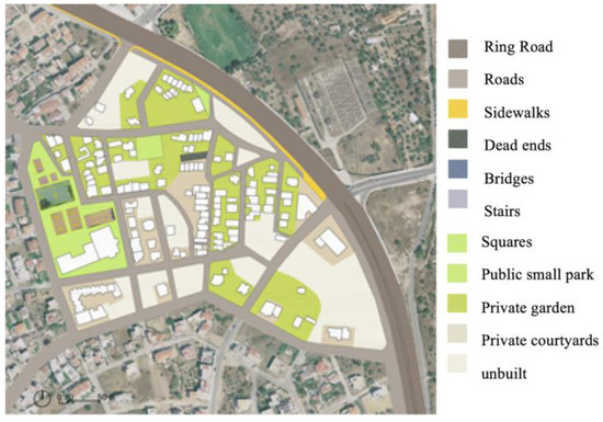 The map, hereafter (see Figure 6) for example in the UA of Echekratidos in the urban agglomeration of Larissa, private and semi-public space in between the building blocks creates some kind of silence islets actually because of the mass and the height of the existing buildings. It was important to show that in situ analysis campaigns were executed (sound recordings, observations, and interviews), and their results combined with the SNM simulation were able to show that the topography of the district, and the given forms of the existing buildings are able to create easily identifiable sound effects when someone walks through the district.