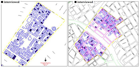 These interviews were systematically located on a GIS map in order to possibly correlate sound phenomena to specific locations. For example in Figure 8, two GIS maps present the buildings where the interviews were conducted.