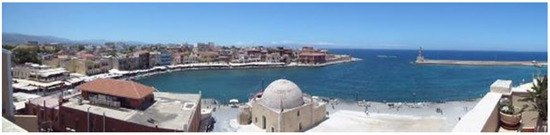 Figure 3. Typical view from the east part of the Old Port of Chania, island of Crete: the sound environment is mainly determined by background noise from the city, local car traffic, people talking, and sounds of the nature (wind in the trees, sea, birds, etc.).