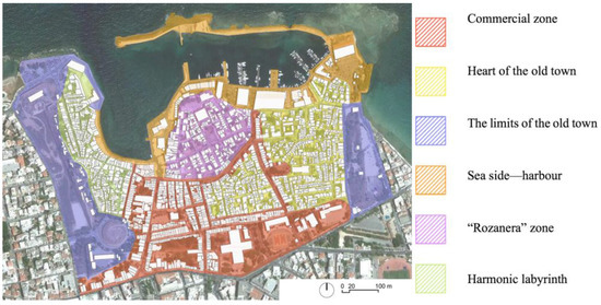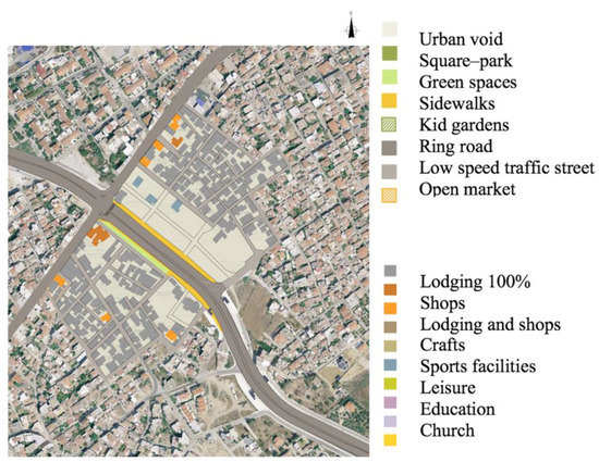 Figure 15. Map of predominant uses in Iolkos UA, Volos. - Recommendations concerning the particularities of the soundscape outline have included creating additional sound aesthetic interventions in order to promote soundscape hearing rehabilitation towards the north part of this urban area. The urban density of this northern part of the urban area is high. As a result, in this part of the city, the sound environment is more similar to that of a small rural village, where it’s practically possible to hear the conversations of residents (or even TV sets) in the street (see Figure 16). Public spaces are narrower and do not easily let the cars pass, and it is appreciated that in these spaces, the sounds of nature are more present. The use of neglected public spots was recommended to create recreation and rest areas where people can meet during the evenings (with or without playgrounds).