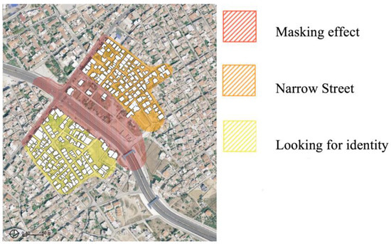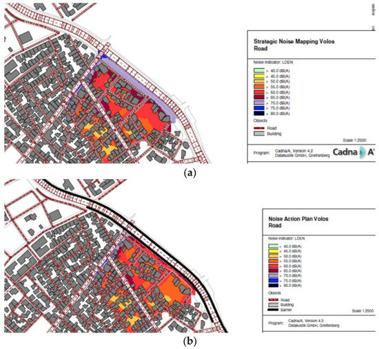 - The environmental dimension of the plan preserves the qualities that are identified by residents. A typical UA e.g., Iolkos, was selected due to its high density of dwellings and because it’s crossed by the semi-urban ring motorway. Another challenge lies in the above-mentioned ring motorway being crossed by a major north–south urban avenue axis defining two inner districts with a different architectural typology, and therefore presenting a space of intense exchanges between two major sections of the urban agglomeration in order to accommodate the interactions, trade, services, and commerce among the buildings (see Figure 13). In this neighborhood, the positive impact of installing several noise barrier solutions was assessed (see Figure 14a,b). The relevant NAP of the urban agglomeration of Volos suggests that an important part of the residential population is exposed to significantly lower traffic noise levels due to the positive effect of the proposed noise barriers. This result mainly involves residential buildings that directly face the ring road. For the north and south parts, in addition to the above mitigation measures, the improvement of the existing traffic fluidity by reducing the starts and stops of the traffic was also recommended. In addition, a major effort was needed for the rehabilitation and improvement of public transportation. Local authorities must promote further public transportation services in order to reduce the flow of private cars.