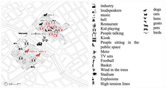 As presented in Figure 11, very easy-to-read icons were used and drawn on the general map of the neighborhood studied in order to quickly understand the main characteristics of the sound environment. The visual logic is used here to show the plurality and localization of the main urban sources that had been noticed by inhabitants. This map can be seen as containing the average behaviors of sound sources in the district. For example, in Figure 11, kids playing are often heard, because traffic is light in this area, and parents let them play in the streets and the small parks of the old city center. In the same way, traffic is of course always heard, but there, people talked more about the sound of bus traffic, which seems to be more noticeable. Actually, many churches are present in this area, but people talk more about two specific bells that can be heard only there, and it’s the reason that the icon is colored with red. Music from radio sets or TV sets are regularly heard in the public spaces of Chania, but the live music of the conservatoire through the open windows is very well-known to the inhabitants (icon of music note colored in red, see Figure 11).