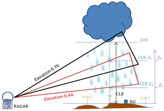 A diagram of the different measurement sources in respect to the vertical axis Z. The picture depicts two radar beams at different elevation levels and gives an example of the heights the elevation of 0.44° observes: , , in respect to the Z-axis, which actually goes from the cloud base (ClB) downwards to the ground. On the ground level, we can see a rain gauge (RG) and cellular antennas of the CML.