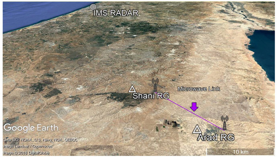 An experiment was performed in order to verify the validity of the suggested method for estimating and , thus effectively deriving the vertical profile of the rain-rates, as described in the previous section. The location of southern Israel was selected for our experiment site, as this region is of semi-arid nature, and thus can enable the occurrence of the Virga phenomenon. This location is at the vicinity of the city of Arad and of the site of Shani, and has a CML of 16 km length, deployed between Arad and Shani. The CML is situated at about 40 meters above the ground level, while recording maximum attenuations once every 15 min. As suggested in the previous section, we included measurements of the weather radar of the Israeli Meteorological Service (IMS); the IMS weather radar performs a complete scan, at different elevations, every five minutes. Two different radar elevation levels were relevant for the experiment: The first one observes at heights of between 355 and 1940 m, and the second one observes between 1275 and 2862 m above ground level for the selected experiment site. Once we were able to estimate the and using the CML attenuation measurements together with the weather radar, as suggested in the previous section, we were able to later derive the estimated values of rain rate at the RGs locations , with the corresponding humidity measurements for each RG location, and compare them with actual RG measurements. The experimental site holds two RGs for the sake of this validation, one near Arad, and the other near Shani, which samples the accumulated rain every 10 min. The experimental site, the mentioned CML, the weather radar, and the two RGs are shown in Figure 2.