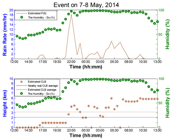 May 2014 event, top subplot: estimated rain rates at the (brown) and the average humidity (green circles). Bottom subplot: estimated levels (brown stars), the average of the estimated (brown), the average of a real measurements nearby (blue), and the average humidity (green circles).