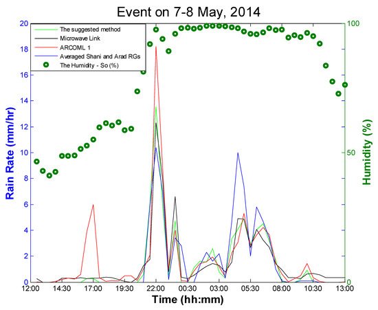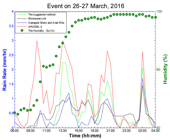 In addition to the storm event detailed above, we decided to include an additional event to test our suggested method. For the event of March 2016, the estimated values of are compared to actual (more accurate than for May 2014 storm) observances at a somewhat nearby weather station (about 30 km away) and are depicted in Figure 5; our estimated matches closely with those of the station. In Table 2, again, as we have no ground truth for , we calculated rain rates at ground level near the two rain gauges and calculated the correlations. Once again, our method provided the highest correlations, except when the rain gauges were compared to their own average (of course, this will show high correlation as for this storm, the correlation between the two rain gauges was high in the first place). In Figure 6, we show the temporal rain rate of the different sources for the March 2016 event, versus the humidity values, over 20 h on 26–27 March at southern Israel. Again, we see a good matching of our suggested method to the CML rain rates, and although it may seem that the values produced by our method are high, we need to remember that this storm produced very low rain rates, so the absolute difference between the ground sources (suggested method, rain gauges and ML) are low.