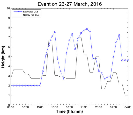 March 2016 event, estimated levels (blue circles and dashes) and the ground truth of observed at nearby weather station (black).