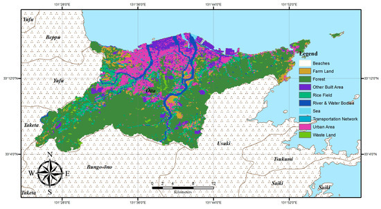 Oita City covers a total area of 502.39 km2, extending from 33°04′11″ N to 33°17′24″ N and from 131°57′46″ E to 131°25′07″ E. Oita is the capital city of Oita Prefecture and has an estimated population of 479,466 inhabitants (as of 30 January 2018) with 218,532 households and a density of 954.35 inhabitants/km2 [35,36]. The city is bounded to the northwest by Beppu City, to the west by Yufu City, to the southwest by Taketa City, to the south by Bungo-ōno City, and to the southeast by Usuki City; Beppu Bay and the Seto Inland Sea are to the north. It has a comprehensible uniqueness between the land cover types, which are mainly rice fields, farm land, forests, waste land, urban areas, road networks, rivers, water bodies, and the sea (Figure 1). Oita City is one of the nation’s leading industrial areas; it spreads over the coastline overlooking the Seto Inland Sea, and nearly 65% of the population is constituted by middle-income families, while 10% represents low-income families [35,36].