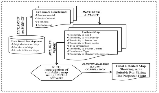 The intended GIS-based MCDA model developed for the siting of an AD plant includes the assessment and integration of environmental, sociocultural, and technical/economic constraints. For this purpose, multi-criteria evaluation (MCE) was selected as the proper way to address the multi-criteria problem. It should be noted that all the calculations and analyses in this study were carried out using Clark Lab’s IDRISI Taiga GIS software [24].