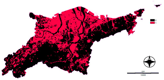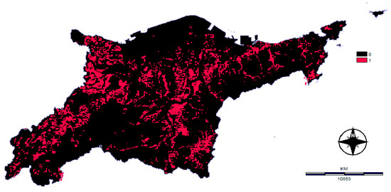 This map is derived from the land-cover map (as in Figure 1), by reclassifying those areas not acceptable for development as 0 s and those places in which development is acceptable as 1 s. This results in a Boolean map (Figure 3). In this case, the only areas that are not available for development were water bodies and forested areas (reclassified as 0). Others (reclassified as 1) can be developed.