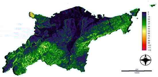 For the technical/economic constraints, the slope gradient is considered as a reasonable key factor. Shallow gradients are preferable to developers given that they are cheaper for construction [24]. Furthermore, most literature also identifies the slope gradient as a significant constraint to be considered [15,16,20,25,30,32]. The map was obtained using ASTER-DEM data analyzed through a module called SURFACE to produce a slope map in units of degrees. It was then run with a reclass module to produce the technical/economic map with 1 assigned as a new value (acceptable zone) to values in the range (0–20) and 0 assigned to values in the range (21–999) (non-development zone) (Figure 5).