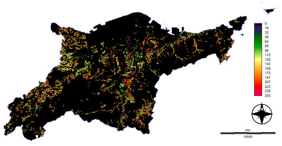 A comprehensive result of standardized factors is given below and is shown in Figure 6. The standardized maps are classified in the range of bytes (from 0 to 255), representing different fuzzy membership decision sets (Figure 6 and Table 2). In this analysis, the suitable fuzzy functions and related control points shown in Table 2 were selected on the basis of a review of the literature in conformity with WMPCL and Oita Prefecture legislation [6,14,15,19,20,21,23,24,25,26,27,28,29,30,31,32,33,34,41,42,43,44].
