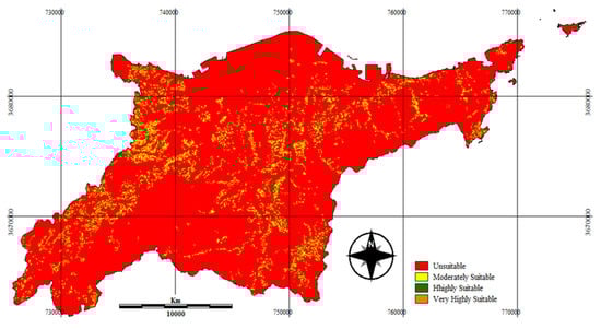 In aggregating the final image, WCL plays an important part, as it allows for full tradeoff among factors and criteria, such that a factor with strong suitability can offset for other factors with weak suitability, provided that the decision for this compensation is made according to the tradeoff weight that is, factor weight [24,42]. The recommended suitable areas for siting an AD plant using all the constraint and factor maps are illustrated in Figure 7.