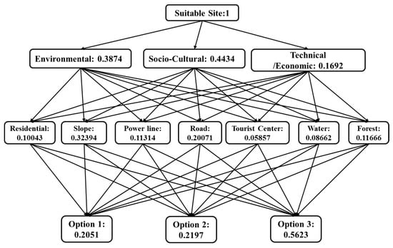The use of GIS-MCDA has arisen in decision-making processes as an important tool in waste management for site evaluation, route construction, site selection, and resource allocation and in making prioritized alternative decisions across policies, sectors, or time periods [19,48]. In this study, WLC was the GIS-MCDA tool employed to analyze and evaluate the suitability of locating a site for an AD plant in Oita City. The AHP hierarchy incorporates a large number of pairwise comparisons between criteria (constraints), sub-criteria (factors), and site alternatives into a reliable set of scale scores to assist in making the final choice. The hierarchy structure in this study included one goal, three constraints (environmental, sociocultural, and technical/economic criteria), seven factors (water bodies, forested areas, residential areas, touristic and cultural centers, roads, slope gradients, and powerlines), and three suitable options (suitable, moderately suitable, and highly suitable) organized into three levels in general.