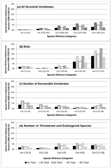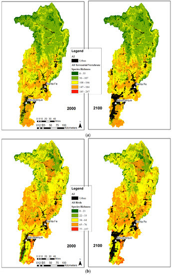 - Boykin, K.G.; Thompson, B.C.; Deitner, R.A.; Schrupp, D.; Bradford, D.; O’Brien, L.; Drost, C.; Propeck-Gray, S.; Rieth, W.; Thomas, K.; et al. Predicted animal habitat distributions and species richness. In Southwest Regional Gap Analysis Final Report; US Geological Survey, Gap Analysis Program: Moscow, ID, USA, 2007. [Google Scholar]