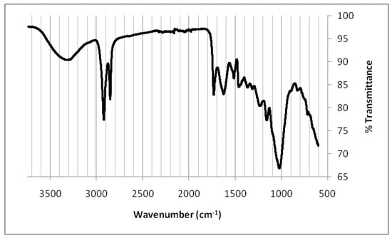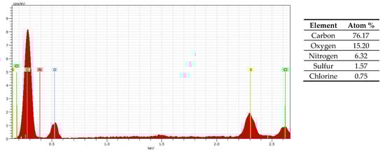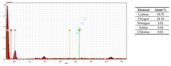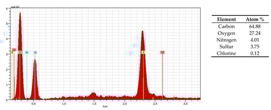 Elemental analysis was performed in duplicate. The average of the two analyses is summarized in Table 2. Note that the percentage of nitrogen in SEGT corroborates well with the suggestion of 25% crude protein in green tea leaves by Ramdani et al. []. As expected, in the case of TosGT, the percentage of sulfur increases dramatically and the percentage of nitrogen goes down.