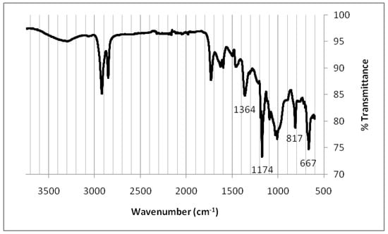 Figure 4 and Figure 5 show the FTIR spectra of SEGT and TosGT, respectively. Note that there is a significant decrease in the intensity of the O-H band in the 3500–3000 cm−1 region. The presence of the tosylate group is substantiated by the peak at 1174 cm−1 assigned to symmetrical stretching and the asymmetrical stretching at 1364 cm−1 of the S=O group in organic sulfonates. Various strong S-O-C stretching bands are seen in the 1000–769 cm−1 region, of which the bands at 817 and 667 cm−1 have been highlighted [].